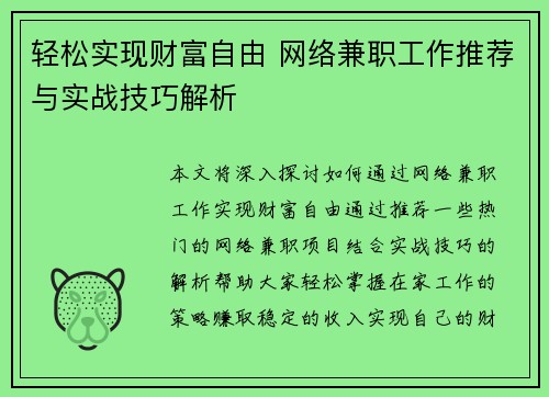 轻松实现财富自由 网络兼职工作推荐与实战技巧解析